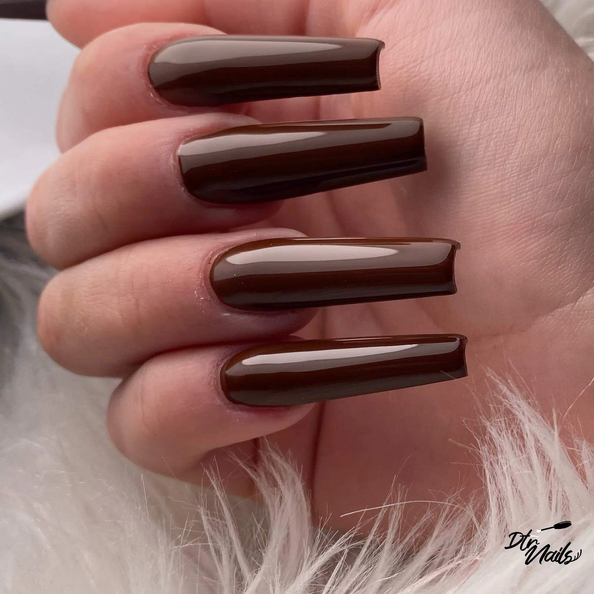 - Posez enfin une couche de finition (Glossy), doigt par doigt, et catalysez 3 minutes sous lampe UV 36 watts ou 120 secondes sous lampe UV/LED en bordant délicatement chaque ongle. Cette finition ne laisse aucun résidu collant et ressort sèche après son passage sous lampe.